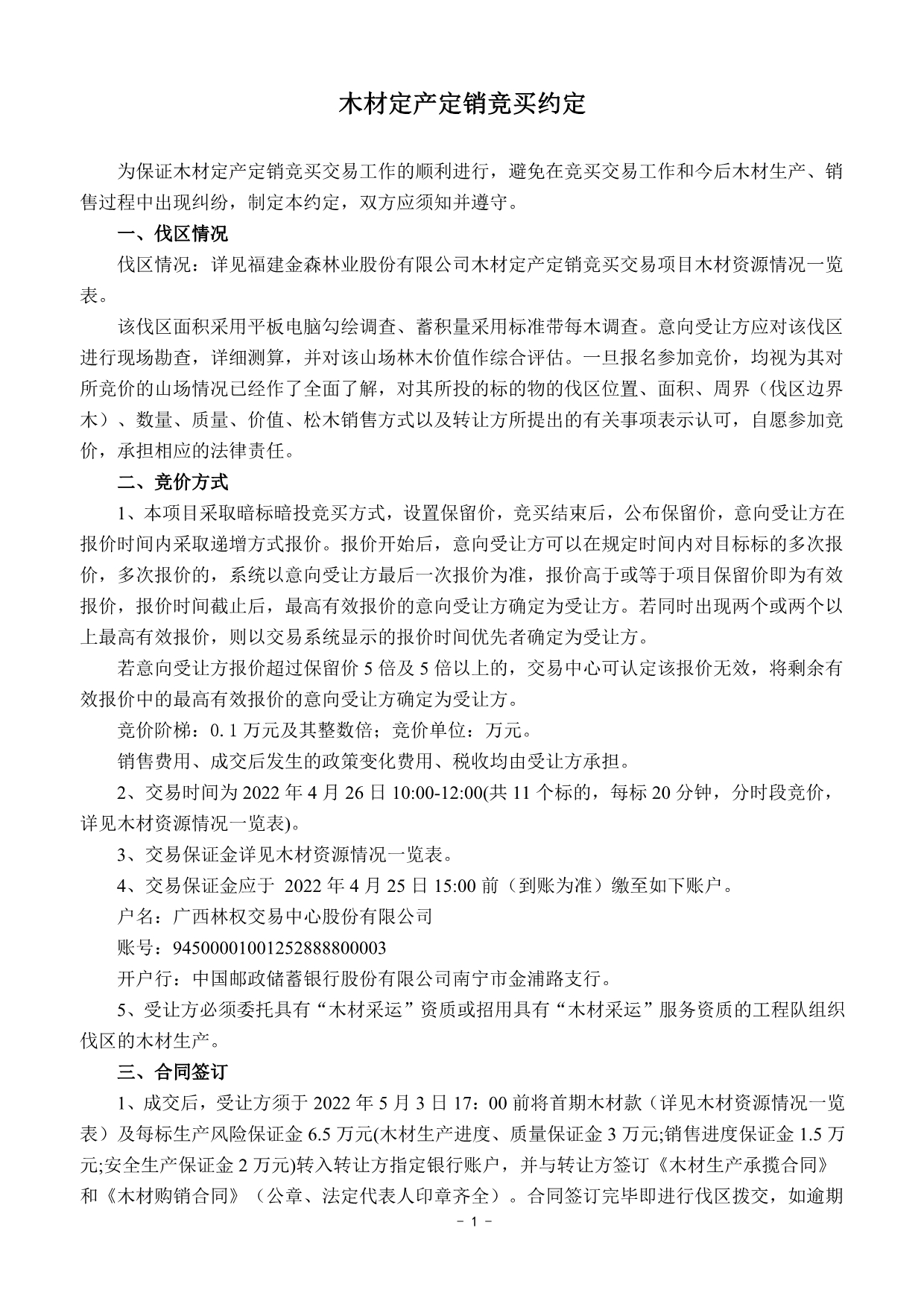 保證金及 處理方式 | 1.須交納的交易保證金詳見木材資源情況一覽表。 2.交易保證金應(yīng)于2022年4月25日15:00前(到賬為準(zhǔn))繳至如下賬戶: 戶名:廣西林權(quán)交易中心股份有限公司 賬號(hào):94500001001252888800003 開戶行:中國郵政儲(chǔ)蓄銀行股份有限公司南寧市金浦路支行 注: ①交易保證金只接受銀行柜臺(tái)、網(wǎng)銀、電匯轉(zhuǎn)賬,不接受ATM轉(zhuǎn)賬、現(xiàn)金繳款; ②交易保證金轉(zhuǎn)賬單上須注明參與競拍哪一標(biāo)的保證金 (如:0426金森1標(biāo)保證金)。 3. 交易成交,在收到交易雙方出具的《款項(xiàng)收訖及正式書面合同簽訂確認(rèn)函》后的5個(gè)工作日內(nèi),受讓方已交納的交易保證金由交易中心直接轉(zhuǎn)到福建金森林業(yè)股份有限公司指定銀行賬戶充抵履約保證金。 4.交易成交,受讓方如未按本公告約定與轉(zhuǎn)讓方簽訂成交文件的,或違反交易中心交易規(guī)則的,其已交納的交易保證金將不予返還; 5.未成交者的交易保證金交易中心將在交易結(jié)束后次日起3個(gè)工作日內(nèi)全額無息返還。 | ||